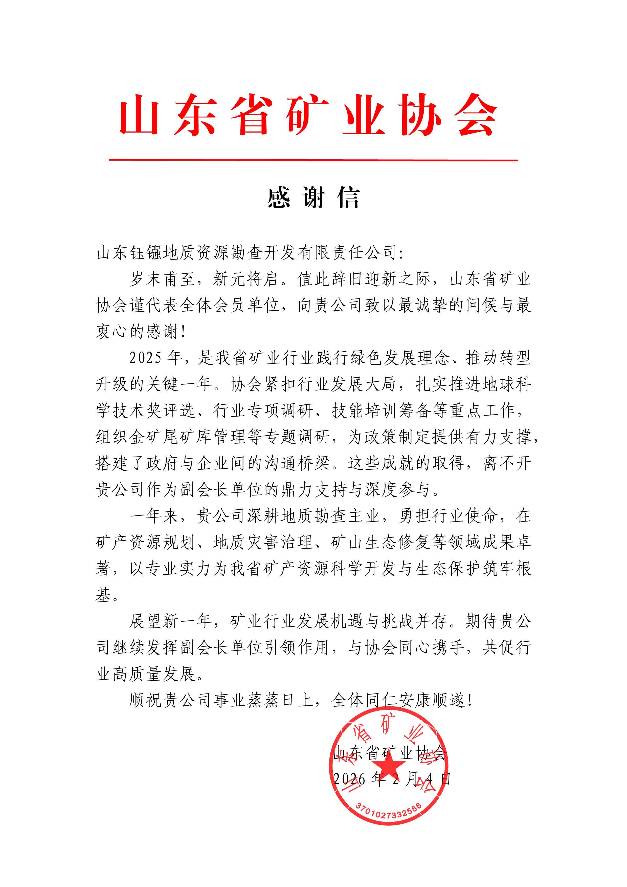 近日,我公司收到山东省矿业协会感谢信,公司作为副会长单位,在2025年全省矿业行业绿色转型与发展中的突出贡献获协会高度肯定。过去一年,公司深耕地质勘查主业,在矿产资源规划、地质灾害治理、矿山生态修复等领域成果丰硕,以专业实力为我省矿产资源科学开发与生态保护筑牢根基。 未来,公司将继续发挥副会长单位引领作用,与协会及行业同仁携手,共促山东矿业高质量发展。