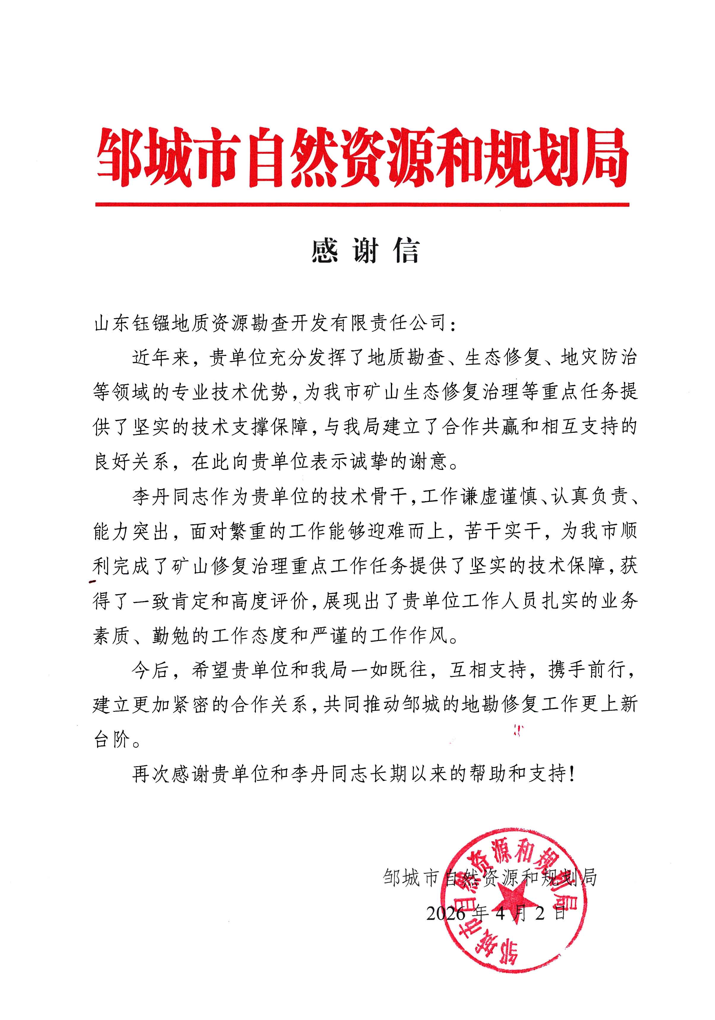 深耕地质领域 彰显责任担当——山东钰镪地质公司获邹城市自然资源和规划局感谢信